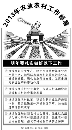 会议指出,明年是全面贯彻落实党的十八大精神的开局之年,继续做好“三农”工作具有特殊重要意义。明年农业农村工作的目标任务是:“保供增收惠民生、改革创新添活力”,就是要确保粮食等重要农产品再获丰收,确保农民收入增长势头不减弱,继续改善农民生产生活条件,进一步消除制约农业发展的体制障碍,激发农村发展活力。