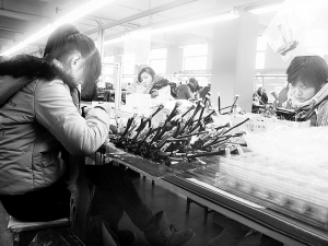 位于沈丘县产业集聚区内的上海光电科技产业园以生产电脑连接线和手机充电设备等为主,成为国内最大的民营电子企业之一——深圳华为的供应商。图为工人们正在紧张生产。(记者 刘彦章 摄)
