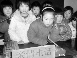 12月23日,商水县舒庄乡杜店小学的留守儿童通过“亲情电话”给在外打工的爸爸妈妈说悄悄话。新年将至,商水县农村中小学校和幼儿园按照县教委统一部署开通了“亲情电话”、“亲情视频”,让农村留守儿童与在外打工的父母沟通亲情。(岳建辉 乔连军 摄)