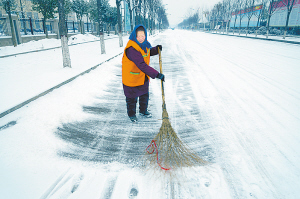 连续两日的降雪令项城大街小巷的路面变得湿滑。昨日,项城市城管局环卫工人全体出动,天不亮就走上道路清扫积雪,保障市民出行安全。(赵献伟 李艳 摄)