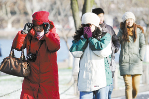 12月30日,游客顶着寒风在杭州西湖边游览。当日,受北方较强冷空气影响,浙江多地在雪后迎来大风降温天气。(新华社发)
