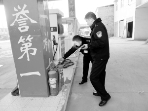 为了保障节日期间辖区治安稳定,连日来,商水县张庄派出所对辖区企业、公众娱乐场所和人员密集场所开展了地毯式安全大检查。图为民警正在对一加油站的消防器材进行检查。(任君箫 李立正 摄)
