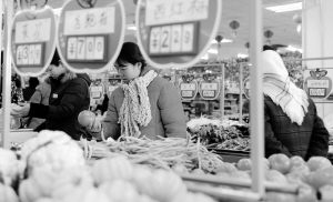 12月30日,市民在河北保定一家超市选购蔬菜。受连续降雪降温天气影响,冬季大棚蔬菜上市量减少,外地蔬菜受寒潮影响运输成本增加,近期河北省16种大路蔬菜价格均持续上涨。据河北省物价局价格监测中心提供的数据显示,河北省8种大路菜平均价格比上月底上涨近3成,比去年同期上涨16.7%。预计随着元旦假期的到来,蔬菜价格仍将继续上涨。(新华社发)