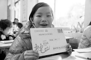 12月30日,项城市第二实验小学三(五)班学生闫孟轲正在展示她写给远在外地爸爸的新年贺卡。该校组织留守儿童给远方的父母寄上贺年卡,让学生从生活中学会感恩。赵献伟 孙红旗 摄