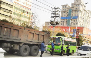 1月4日,执勤交警在市区八一路与交通大道交叉口查处违规车辆。(记者 李瑞才 摄)