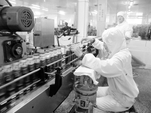 鲁花花生油周口公司落户我市后,不仅带动了全市花生种植,而且以自己的产品质量赢得了用户青睐,鲁花花生油、芝麻油在市场上很受青睐。图为该公司油品生产线正在紧张生产。(记者 刘彦章 摄)