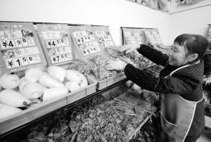 1月6日,南昌市东湖区聆江花园小区平价商店一名工作人员在摆放蔬菜。为缓解农民“卖菜难”和居民“买菜贵”的矛盾,南昌市在新年前推出首批40余家农副产品平价商店,启动农副产品“农社对接”的直销试点工作,将各类农副产品“打包”送进社区,为百姓提供基本生活必需的农副产品。(新华社记者 周科 摄)