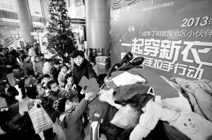 1月5日,天津华夏未来幼儿园的孩子在排队为新疆贫困儿童捐赠新衣。