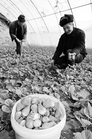 草莓飘香富农家 近日,宁夏银川市贺兰县温室草莓开始陆续上市。据了解,贺兰县近年来在科技人员的带动下,引种美国、以色列优质草莓品种,每棚每年可为果农带来2万多元收入,为农民增收带来新路。图为宁夏银川市贺兰县金贵镇银河村农户在田间采摘草莓(1月5日摄)。