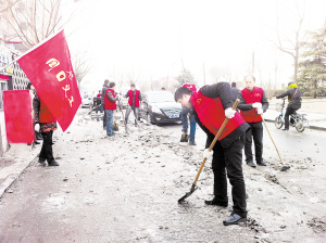 昨日下午,周口义工协会的成员在滨河路中段清除积冰。在中州大道与滨河路交叉口东300米处,有一段长50多米、存留数日的积冰,给过往行人和车辆通行造成了许多不便。周口义工协会得知情况后,组织成员清除积冰,得到了过往行人的一致好评。(记者 王映 摄)