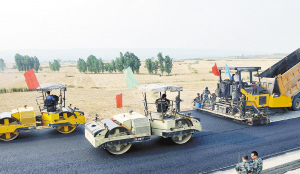 几台大型施工机械在郑(州)卢(施)高速公路洛宁段铺沥青路面(2012年6月20日摄)。随着总里程348.2公里的豫西5条高速公路于2012年年底全部建成通车,河南省实现了所有县(市)20分钟上高速的目标,在全国率先实现“县县通高速”,并以5800公里的高速公路总通车里程,连续七年位居全国第一。