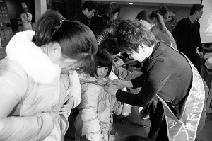 1月8日,在项城市某爱心企业捐赠现场,爱心员工正在给孩子们试穿新衣。进入冬季以来,该市组织开展了形式多样的爱心捐赠活动,让贫困家庭的学生感受到冬日里的温暖。(赵献伟 摄)