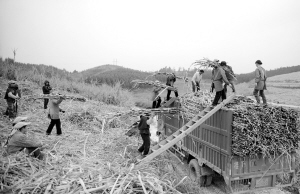 1月8日,在广西融水县融水镇,农民将甘蔗装车送厂压榨。连日来,强冷空气频繁侵袭广西,持续低温雨雪冰冻天气使广西甘蔗主产区不同程度遭受冰冻侵害。目前,广西各地蔗农抓紧时机投入甘蔗砍收、运输工作,尽快把受灾甘蔗进厂压榨,以减少极端天气对蔗糖生产造成的损失。