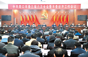 本报讯 (记者 李凤霞) 1月9日,市委三届六次全会暨市委经济工作会议在周隆重召开。这次会议将市委三届六次全会和市委经济工作会议合并一起召开,是我市改会风、转作风的具体体现。会议的主要任务是深入学习贯彻党的十八大、中央经济工作会议和省委九届五次全会、省委经济工作会议精神,审议通过《中共周口市委关于深入学习宣传贯彻党的十八大精神,加快实现富民强市新跨越的决议》,讨论审议《市委常委会2012年工作报告》,回顾总结我市2012年的经济工作,分析研判当前的经济形势,安排部署今年经济工作。