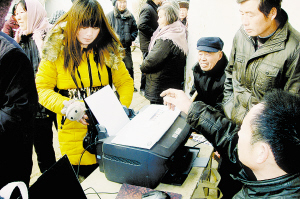 昨日,商水县平店乡组织的“流动劳动保障所”到杜庄村集中办公,当天共为该村330多名60岁以上老人免费进行信息采集和办证,对520多名已参加社会养老保险的村民进行核实登记。(赵永昌 摄)