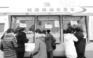 1月11日,购票者通过铁路移动售票车买票。当日,在北京朝阳社区学院里,两辆铁路移动售票车开始对外售票。售票车可提供售票、取票、查询等多项服务,与车站的售票窗口功能一致。移动售票车的开设,为外来务工人员等群体购票提供了便利。 新华社记者 李文 摄