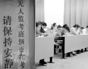 河北师范大学推行“无人监考班级” 1月15日,在河北师范大学的一个“无人监考班级”考场内,学生在无人监考的状态下参加考试。近日,河北师范大学经过自主申报、中期考察等环节的严格筛选后,从36个申请班级中选拔出11个班级成为本学期的“无人监考班级”,即在考试过程中,以班级为单位考试不设立监考人员,学生自我约束。