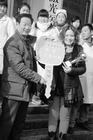 1月13日,周口耳鼻喉医院院长王银邦将一辆小轿车钥匙交到了周口电视台举办的《春晚有我》金奖获得者李红霞手中。周口耳鼻喉医院成立于2003年,是豫东南地区具有一定影响和规模的现代化专科医院,到目前该院已为十万余人治愈了头痛头晕、各种耳鼻喉疾病。为促进我市文化事业的发展,鼓励更多的人参与到活动中,该院为此次比赛提供了金奖小轿车一辆、银奖电视机一台、铜奖电动车一辆,价值十多万元。刘艳霞 摄