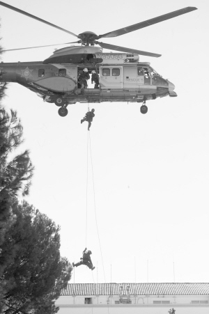 洛杉矶郡举行校园反恐演练 1月17日,在美国洛杉矶郡克莱尔蒙特大学园区,两名特警从直升飞机上索降。从1月16日起,洛杉矶郡消防局和警察局连续三天举行校园反恐演练,约400名消防员和警察以及近5000名学校师生参加演练。