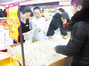 今天是腊八,百姓有喝腊八粥的习俗。昨日,记者走访周口市区各大超市发现,商家已把配好的各种五谷杂粮等腊八粥原料摆放在显眼的位置,市民们纷纷采购。记者 王映摄