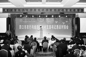 为进一步加大服务“三农”工作力度,元月9日,周口农行邀请全市83位经济强村村党支部书记欢聚一堂,隆重举办全市经济强村村支部书记恳谈对接会。会上,农行员工向与会的村支书们进行了形象展示和晨会情景演练,并开展了新农村建设的金融产品宣讲,各支行与村党支部书记们签订了合作意向协议。图为肯谈对接会现场。张建中 彭涛 摄