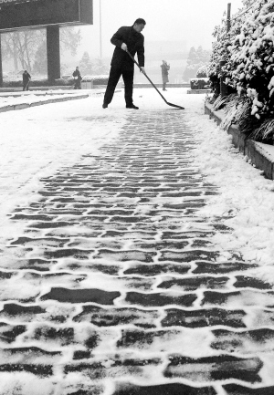 1月20日,在郑州市区的一个休闲广场内,一位市民在清扫路面上的积雪。 新华社记者 王颂 摄