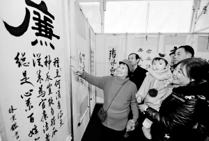 1月22日,市民在福清市举办的“迎新春反腐倡廉宣传教育活动”上观看廉政书法作品。当日,福建省福清市举办大型“迎新春反腐倡廉宣传教育活动”,通过廉政书画作品展、现场为市民书写春联、廉政文化节目汇演等寓教于乐的形式,进一步增强廉政文化的教育、示范、熏陶和导向作用,倡导干部群众过一个廉政、祥和的春节。 新华社发