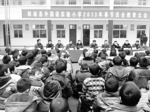 1月22日,郸城县外国语实验小学召开安全教育大会,邀请公安、消防等人员向广大师生讲解安全知识,增强全校师生安全意识。(记者 卢好亮 通讯员 朱金光 摄)