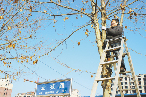 冬季是树木生长的休眠期,对道路两旁的树木进行修剪,一方面可以减少病虫害的发生几率和冬季刮风下雪造成的损害,保证行道树的健康生长。另一方面可以防止树枝过长阻碍交通,方便市民出行,同时也能使城市更加美观。(朱亚洲 摄)