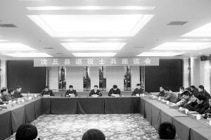 本报讯 (记者 韦伟 通讯员 迟驰 文/图)2月1日上午,沈丘县召开迎新春退役士兵座谈会,县领导皇甫立新、胡恩勇、秦岭、杨所超、汪守保等出席座谈会,县农业局、工商局、卫生局等有关职能部门负责人参加了座谈会。县委常委、常务副县长胡恩勇主持座谈会。