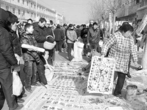 春节前夕,商水县魏集镇的年画市场成为年关大集的一道美丽风景线,既有生肖年画、门神年画等传统年画,又有幸福家庭行动、打工奔上小康路等方面的创新年画,吸引着赶集人的眼球。图为红火的年画市场。 苏建广 摄