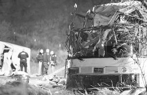 美国南加州发生重大交通事故死伤30余人 2月4日凌晨,在美国南加州圣贝纳迪诺县,警察检查事故现场。当地时间2月3日下午6时30分,一辆旅游巴士在南加州圣贝纳迪诺县发生严重车祸,官方证实已有至少8人丧生,另有27人受伤,其中15人伤势较重。新华社发