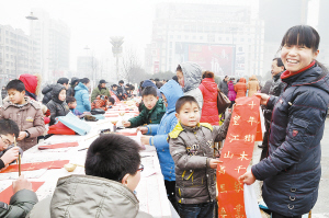 昨日上午,团市委组织我市30多名“小书法家”在市区五一广场现场写春联,并将500余幅春联送给来往群众。(记者 王映 摄)