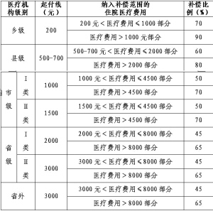 一是科学设置起付线和补偿比。对患者住院医疗费用实行分级分段补偿。参合农民到基层医疗机构就医,如花费同等的医疗费用,在基层医疗机构报销的医疗费用比例将高于在上一级医疗机构报销的医疗费用比例。