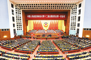 三月的北京春意盎然,人民大会堂万人大礼堂灯光璀璨。象征全国各族人民大团结的政协会徽悬挂在主席台正中,十面鲜艳的红旗分列两侧,格外醒目。