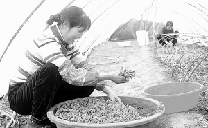 近年来,商水县积极引导农民调整作物种植结构,大力发展瓜菜生产,农民的经济收入有了显著提高。图为商水县巴村镇吕刘行政村两位农民正在大棚内移栽菜苗。 吕俊杰 摄