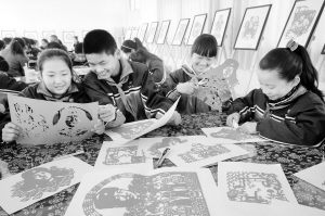 3月3日,在浙江省湖州市德清县乾元镇中心小学剪纸室,学生们在整理雷锋故事剪纸作品。当日,由乾元镇中心小学100名学生历时1个多月,以雷锋生前的40个故事及“当代雷锋”10名德清楷模为题材创作的50件剪纸作品亮相,以纪念毛泽东“向雷锋同志学习”题词发表50周年,传承和弘扬雷锋精神。新华社 发