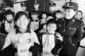 3月4日,“小雷锋”杨林昆同学(前左)在表彰仪式上接过奖品。当日,山东青岛沙子口边防派出所与辖区小学联合开展的“我们身边的小雷锋”评选活动揭晓,首批20名品学兼优的“小雷锋”受到表彰。获奖的孩子们表示会继续弘扬雷锋精神,带领同学们力所能及地多做好事、帮助需要帮助的人。(新华社记者李紫恒 摄)