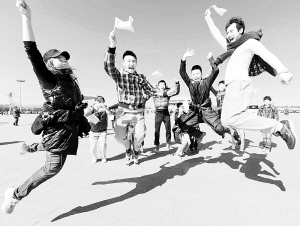 3月4日,来自新疆乌鲁木齐的游客在天安门广场欢呼。当日,北京晴空万里,游客纷纷来到天安门广场畅游。十二届全国人大一次会议将于3月5日在北京人民大会堂开幕。