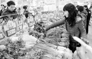 3月5日,市民在河北保定一家超市内选购蔬菜。商务部网站“商务预报”栏目3月4日发布报告,由于全国大部气温回升并且天气晴好,蔬菜生长速度较快,上市量增加,上周18种蔬菜平均批发价格普遍回落,比前一周下降8.1%,连续两周下降,累计降幅14.5%。新华社 发