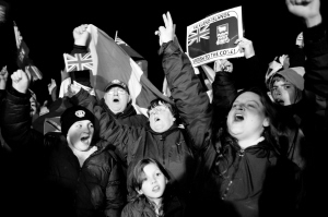 3月11日,在马尔维纳斯群岛(阿根廷方面称谓,简称马岛,英国称福克兰群岛)首府阿根廷港(英国称斯坦利港),当地居民得知投票结果后欢呼庆祝。马岛首席行政官基斯·帕吉特11日宣布,马岛公投结果当天揭晓,98.8%的选民支持继续保留英国“海外属地”政治地位。