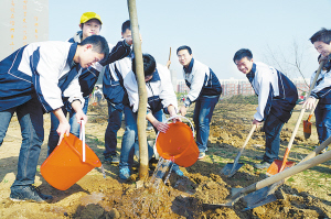 又是一年春光好。日前,项城市的学生志愿者参加喜迎植树节爱心护绿植树活动,按照选点、挖坑、栽植、浇水的步骤,学生们认真完成了树木种植,为大地添上了新绿。(赵献伟 摄)