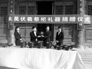 3月7日,在淮阳太昊陵统天殿月台前,淮阳民间艺人张辉把精心烧制的黑陶祭祀专用礼器捐赠给太昊陵管理处。这套黑陶祭器共15件,有3种器型,其中包括簋、五谷盘和果盘各5件。据了解,黑陶始于龙山文化时期,汉代后,黑陶烧制技艺逐渐失传。依据制陶技艺,在继承传统基础上,张辉先生成功复原了黑陶烧制技艺。这套黑陶祭祀专用礼器历时半年完成。(记者 侯俊豫 摄)