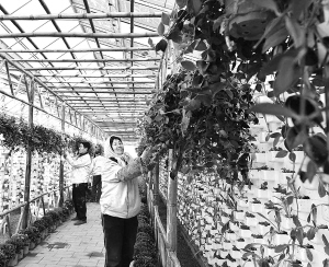山东省即墨市积极探索将光伏、现代农业和新型城镇社区有机结合,打造新型城镇化“太阳能小镇”。该模式将多个自然村的土地集中起来,建设光伏农业科技大棚,当地农民以土地入股并就近在棚内劳动,通过股金分成带来财产性收入,通过劳动带来工资性收入。由企业投资建设“太阳能小镇”的中心社区,并配套建设一定规模的光伏大棚,棚内种植高附加值作物,棚顶利用太阳能发电,产生的清洁电力供社区使用。目前,即墨市已开发太阳能光伏大棚500余亩,正加快建设“太阳能小镇”。图为农民在一处太阳能光伏大棚里管理立体栽培的蔬菜。 新华社发(宁友鹏 摄)