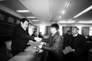 在3月15日召开的全市教育工作会议上,各县市区教体局局长向市教育局递交治理教育乱收费和学校安全工作目标责任书。(记者 刘华志 通讯员 张亮亮 摄)