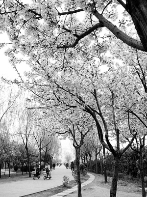 早春二月,市区滨河路柳丝飞扬,桃李花开,美景如画。(王映 摄)
