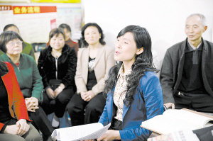 3月19日,全国人大代表、四川省眉山市仁寿县文林镇文林路社区党总支书记唐群容(前)向社区群众宣讲“两会”精神。当日,刚参加完第十二届全国人民代表大会第一次会议回到家的全国人大代表唐群容开始向社区群众宣传“两会”精神。今年47岁的唐群容是一名社区干部,工作10年来,她一直扎根基层,坚持向群众宣传党和政府的各项方针政策。(新华社发)