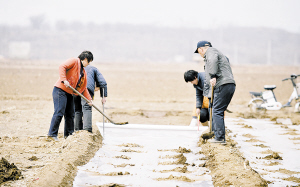 3月19日,河北省满城县吴家庄村的农民为栽种好的甜玉米覆盖薄膜。随着天气转暖,冀中各地农民利用晴好天气纷纷抢抓农时,犁地追肥、盖膜浇水、育种栽苗,积极投入到各项农业生产中,田间里一派忙碌景象。