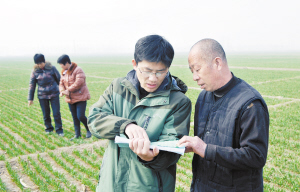 3月21日,河北省望都县农业局的农业技术员王光辉(右二)在南王屯村向村民普及冬小麦春季管理知识。时下冬小麦即将进入春季管理阶段,河北省望都县农业局提早派出农业技术人员深入田间地头,帮助农民查看冬小麦墒情,指导农民适时追肥、浇水,做好冬小麦春季管理。(新华社发)