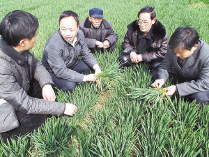 连日来,商水县各级各部门抓住当前天气晴好、气温回升等有利时机,组织动员群众迅速掀起了化学除草、中耕施肥、一喷三防为主的麦田管理高潮。图为县农业局农艺师张新振在平店乡王老村查看苗情并作技术指导。 (赵永昌 摄)